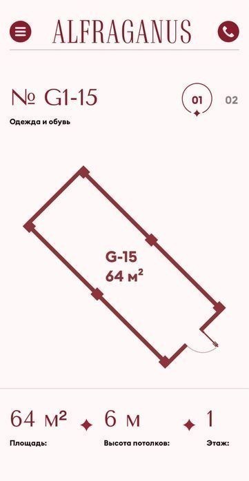 Продается срочно коммерческая помещение в новом действующем ТРЦ Alfraganus (без ремонта, коробка). Площадь: 64 м2 Цена: 125 000 $ Этаж: 1 Высокий потолок - 6 метров, возможность возведение второго уровня. Помещение подойдет под любой вид деятельности. Например: офис, магазин женской, мужской и детской одежды, шоу-рум, ателье, обувной бутик, свадебный салон и т. д. Для более подробной информации звоните! Shoshilinch sotiladi! Yangi faoliyat yuritayotgan Alfraganus savdo markazida joylashgan tijorat dokani (ta'mirsiz, “korobka” holatda). Maydoni: 64 m² Narxi: 125 000 $ Qavat: 1 Shift balandligi: 6 metr - ikkinchi qavat qurish imkoniyati mavjud. Dokan har qanday turdagi faoliyat uchun mos, masalan: ofis, ayollar, erkaklar yoki bolalar kiyimlari do‘koni, shou-rum, atelye, poyabzal butigi, to‘y salonlari va boshqalar. Batafsil ma'lumot uchun telefon orqali bog‘laning!