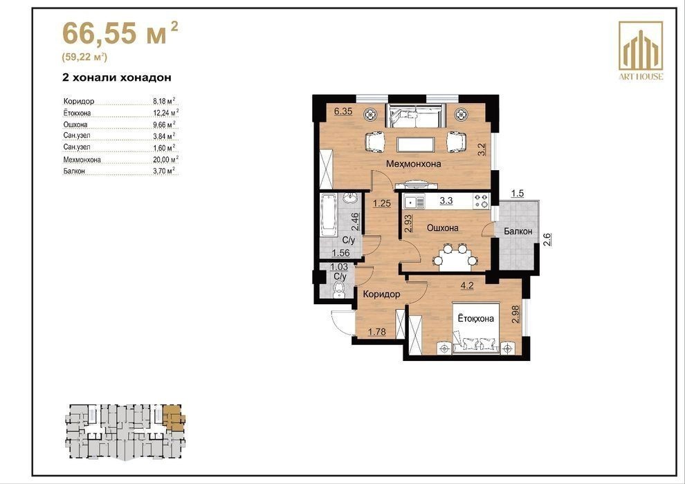 2 хонали уй сотилади. Локацияси шахар марказида. Паспорт стол олдида жойлашган "Art House" компанияси уйлари. - умумий майдони 66.55 м2 - хар бир подъезда 2 та лифт - коробка холатда - ипотека ва субцидияга хам булади - нархини яна келишамиз *********