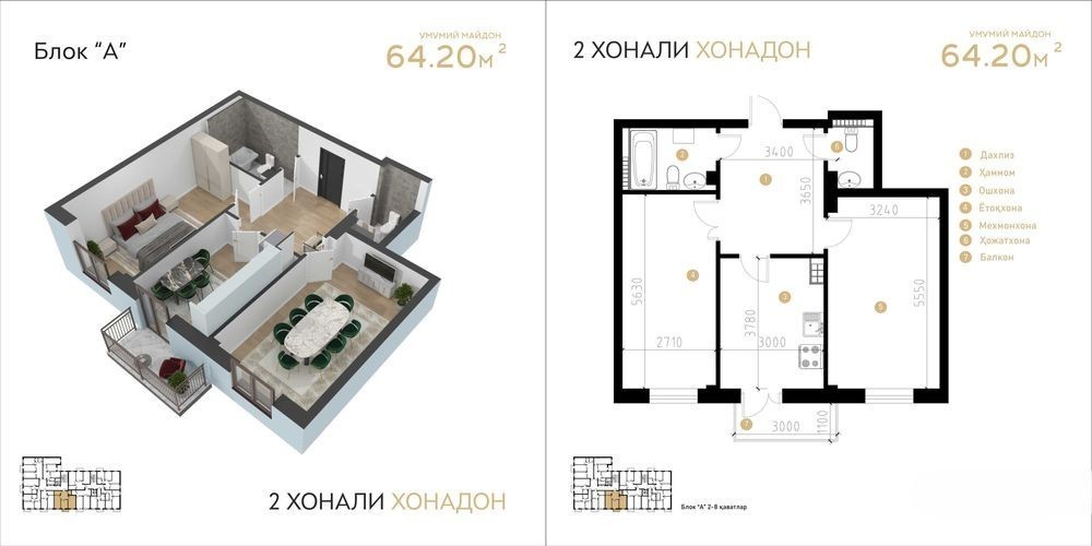 Продаётся 2-комнатная квартира в новом жилом комплексе! Ориентир: Уч Кахрамон круг Этаж: 8 из 9 Площадь: 64,2 м² Состояние: черновая отделка Цена за м² (со скидкой 20%) - 6 960 000 сум Общая стоимость: ********* сум ≈ 35 190 $ Рассрочка: до 24 месяцев Срок сдачи: 1 квартал 2027 года Преимущества: • Высота потолков - 3 метра • Просторная планировка • Удобная транспортная развязка • Надёжный застройщик Подробности по телефону: + ********* Telegram: AbbosKW Есть и другие варианты новостроек - звоните или пишите!