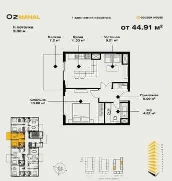 ЖК Oz Mahal 2 комнатная студия 46м2 с кадастром готовым
